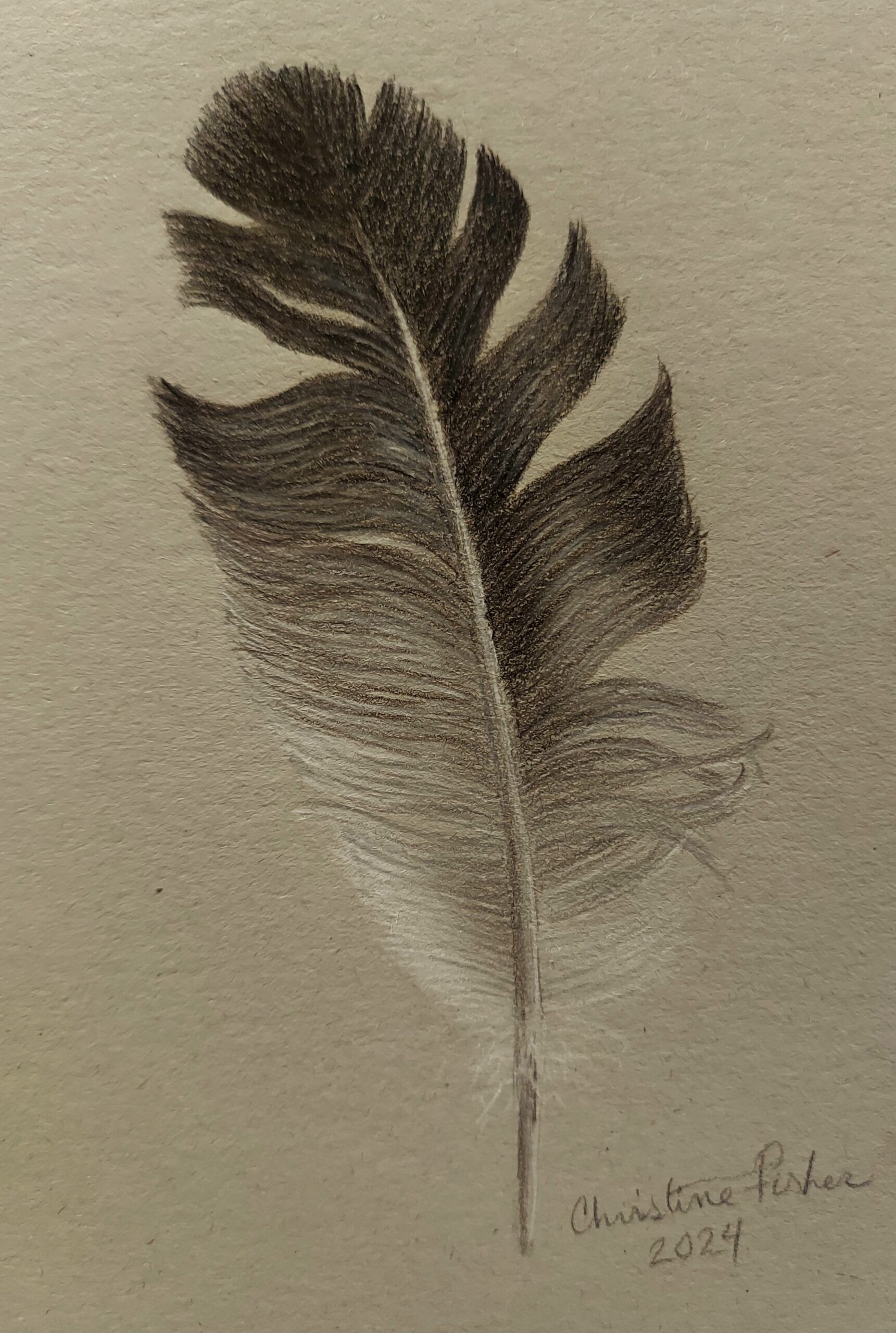 I tried combining this colored pencil feather with digital framing and additions. I don’t think that digital art and analog colored pencil make a winning multimedia combination. I really like the way the feather turned out on paper, though! This was homework for Val Webb’s yearlong course.