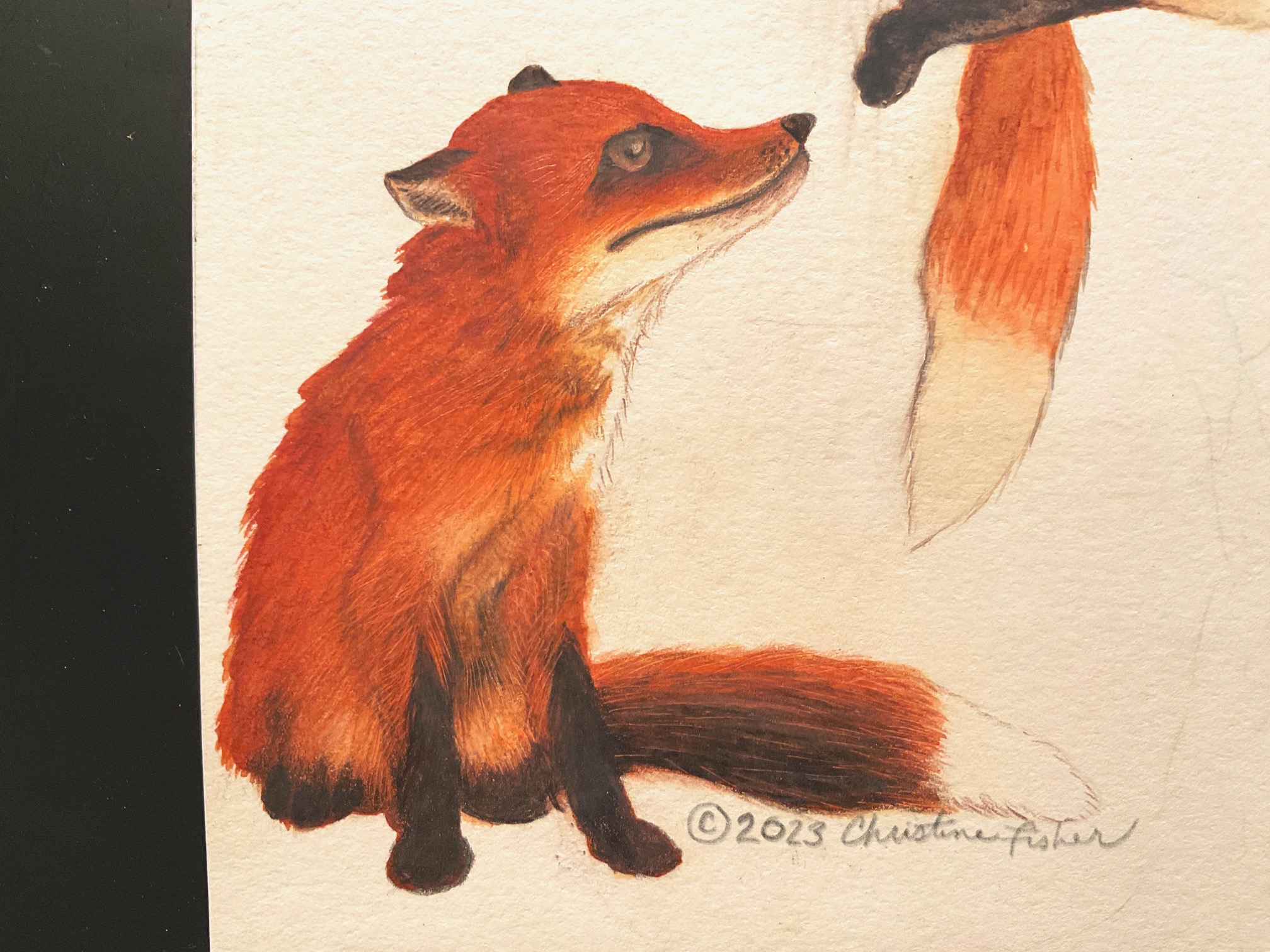 The other tail in the upper right corner is because this is my second attempt. I pencilled in three foxes, expecting to need a few tries with the lesson. I clearly live in a drier area than Val Webb, because my paint dries a lot faster than hers. Also, the first time around, I have to watch a section and then pause to follow along. It’s hectic and not having the wet paint last matters. So you’re seeing fox #2. That’s the nice thing about the visual arts vs live theater, though. You only see fox #2. 😉