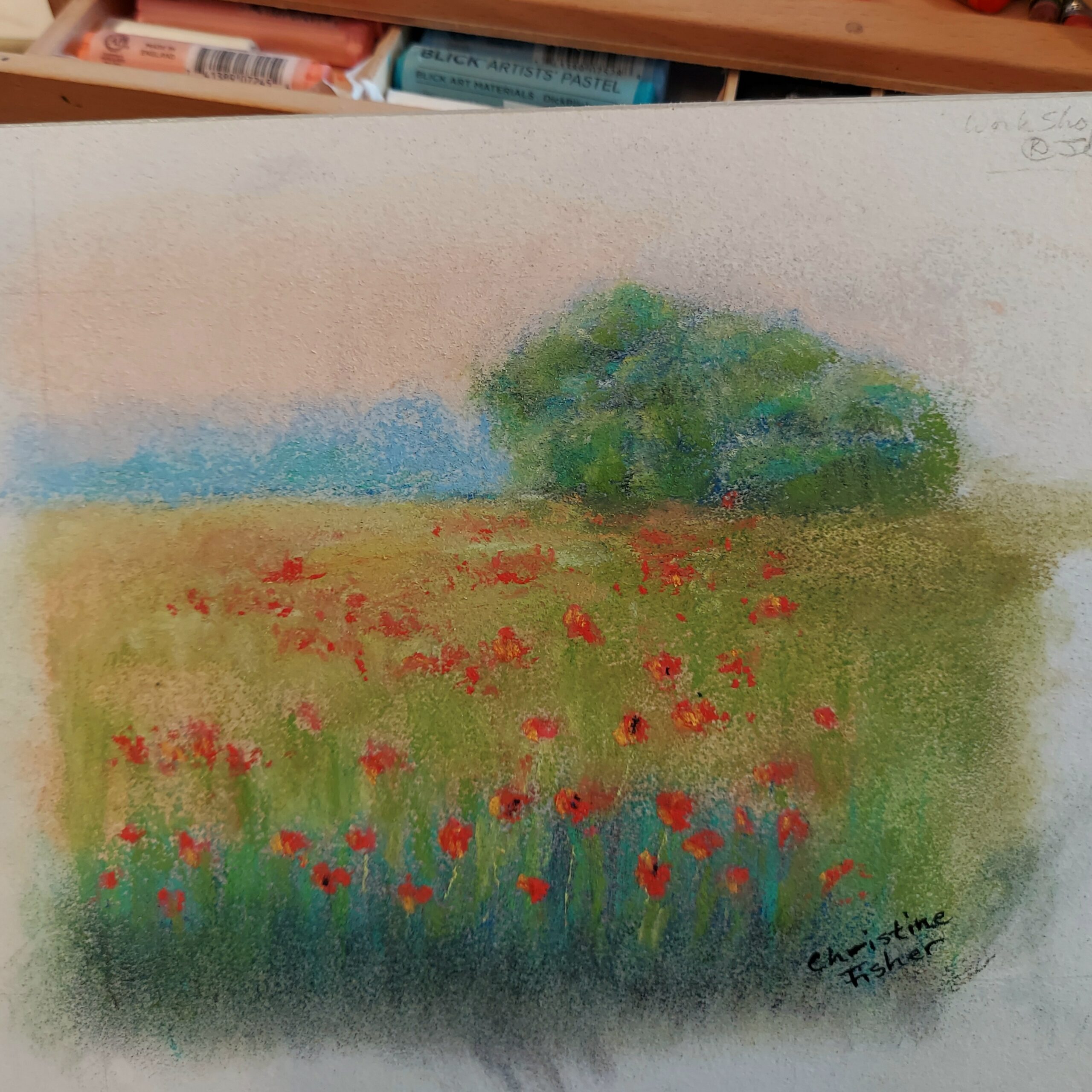 I love working in the mediums I call “smoosh” or “squoosh”, depending on the day. If I have to wear an apron, wash or wipe my hands frequently, and vacuum afterwards, it counts. Pastels are possibly the most squoosh of all the smooshy mediums: graphite dust, charcoal in any form, pastels… they are so satisfying to do, but so messy. I’m usually rather fastidious about any kind of handiwork, but this is a case of consistency being the hobgoblin of small minds. My, what a pretentious way to excuse my occasional messy inclinations! LOL