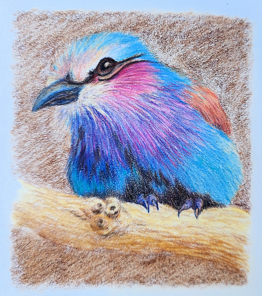 This project for Val Webb’s Birds in Colored Pencil course introduced me to either the prettiest national bird or a cunning little baby muppet from Jim Henson’s Labyrinth that escaped before its scene was shot. It also introduced me to some new techniques, which is why I’m taking the course. I’m going to be a bit sad when I’m done with it. I finished this one during an afternoon relaxing at a campsite in the redwoods, watching dark-eyed juncos, western blue jays, and robins go about their business. A chipmunk literally ran under my chair during the final detail work. Yes, while I was in it.